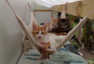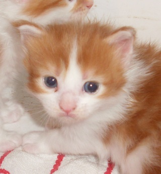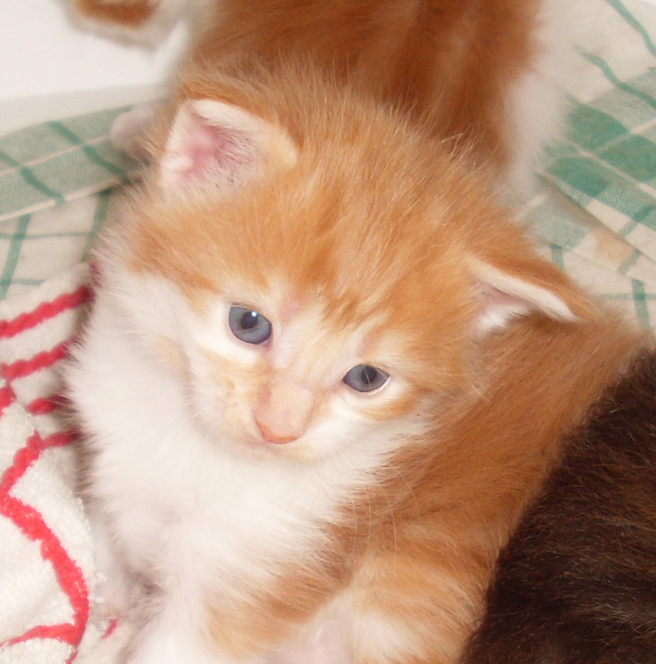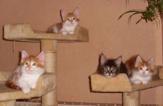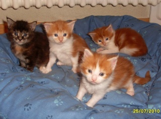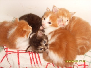 Die Kitten haben die Augen offen und jetzt (nach 6 Tagen) ein Mindestgewicht von 257 gr, Brisko hat 299gr. ! hier mit 20 Tagen-von links: Brisko(500gr), Barbarella(520gr), Betty(430gr), Bonny(470gr)